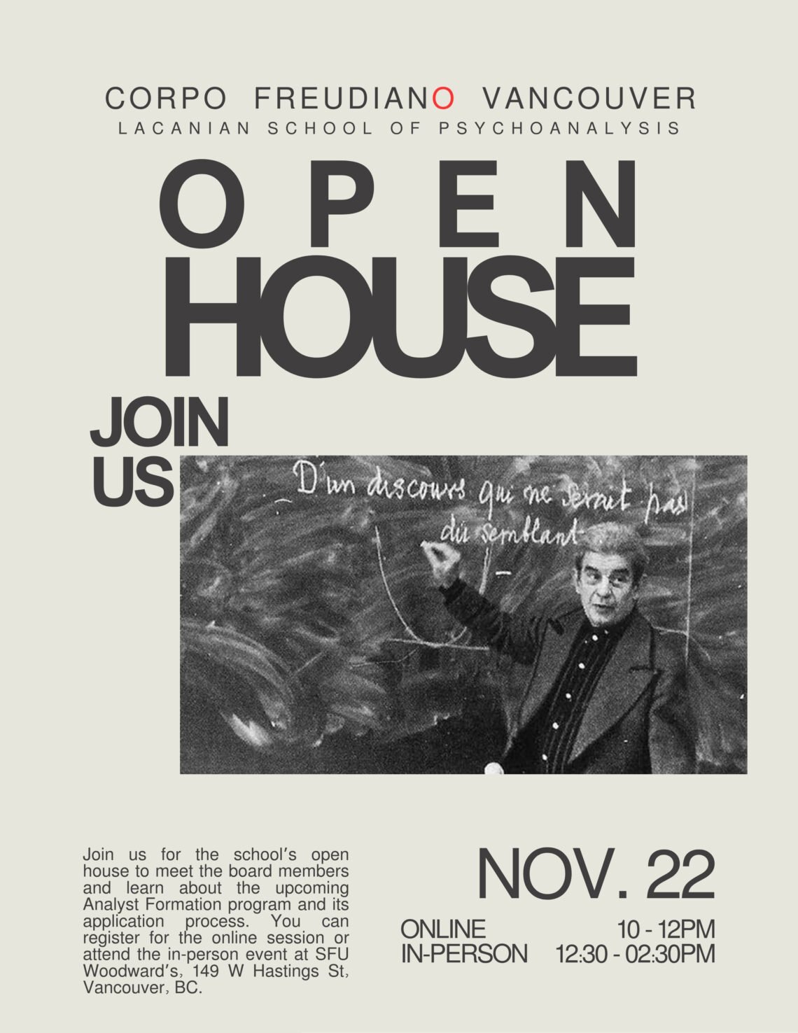 OPEN HOUSE CORPO FREUDIANO VANCOUVER This event took place on November 22nd, 2025. Watch the recording HERE Apply HERE to CFV School. Application deadline: January 04th, 2026.