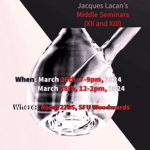 On Jacques Lacan’s Middle Seminars (XII and XIII) In collaboration with SFU Institute for the Humanities When: March 26th, 7PM to 9PM Where: Room 2205, SFU Woodwards Description: The “middle seminars” occupy a curious position in Lacan’s career. Between the major turning…